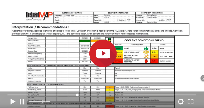 Each report highlights potential coolant system issues such as signs of corrosion/erosion/ cavitation, contamination, glycol degradation due to overheating, air leaks, additive level depletion, coolant dilution, electrolysis and overall coolant health and recommends if action needs to be taken.
